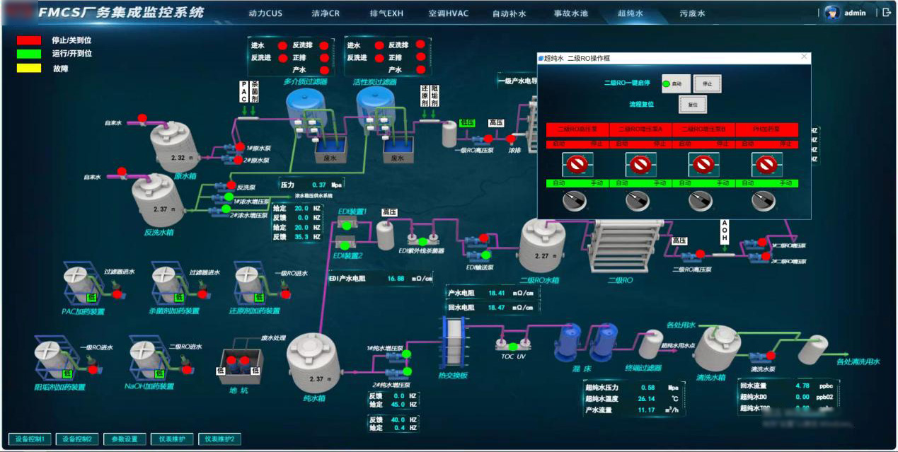 系统按动力CUS、洁净CR、排气EXH、空调HVAC、自动补水、事故水池、超纯水、污废水等八大子系统进行流程可视化展示,覆盖生产工艺用水、恒温恒湿恒压环境控制及废气废水处理等环节。实时监测运行状态与工艺参数,优化调节PID参数,保障生产环境稳定可靠。