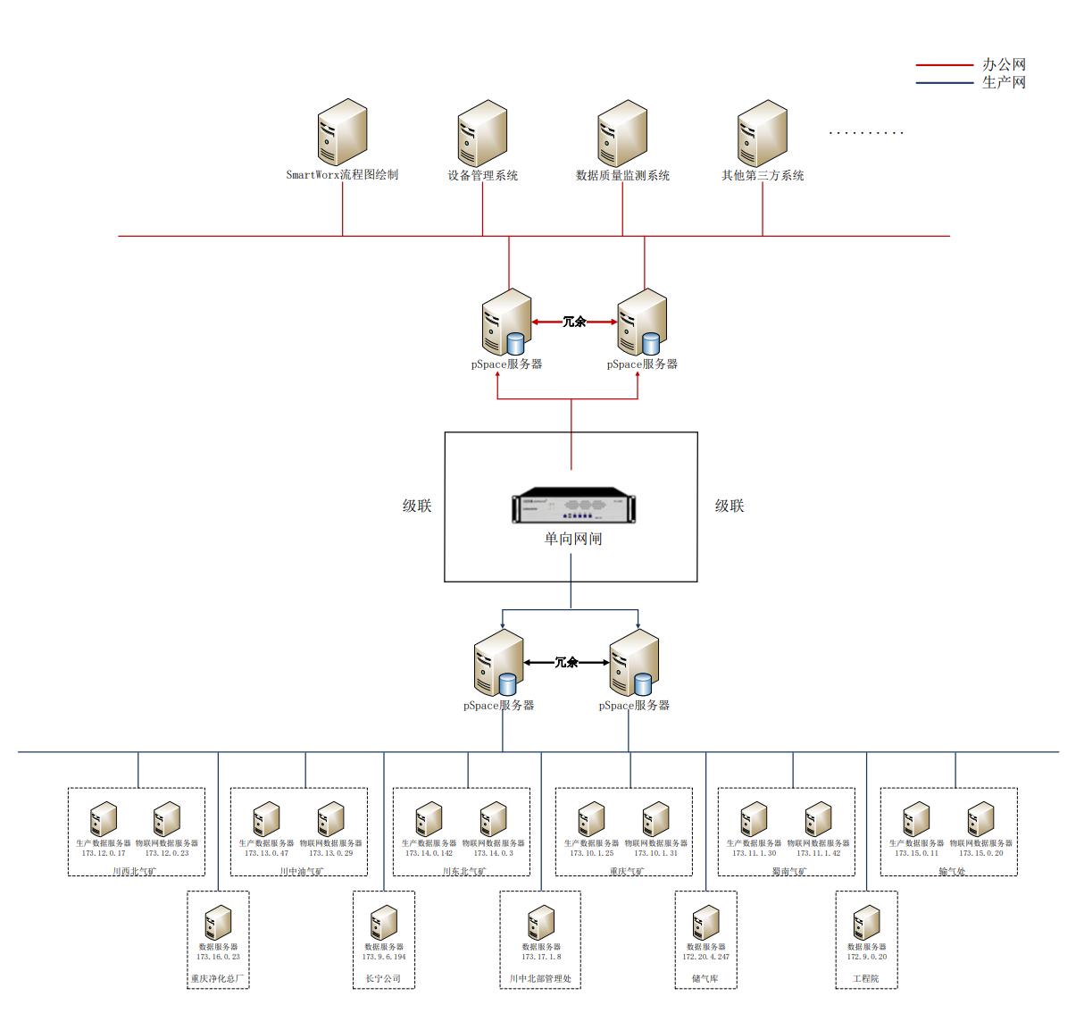 系统主要包括pSpace实时历史数据库、FSmartWorx云端可视化软件、资产设备建模系统、数据质量分析系统。需要配备的硬件包括实时服务器(热备冗余)、历史服务器(热备冗余)、磁盘阵列柜、Web服务器、UPS电源、网络设备等;层级之间配备了隔离网关等安全设备保证系统信息安全。