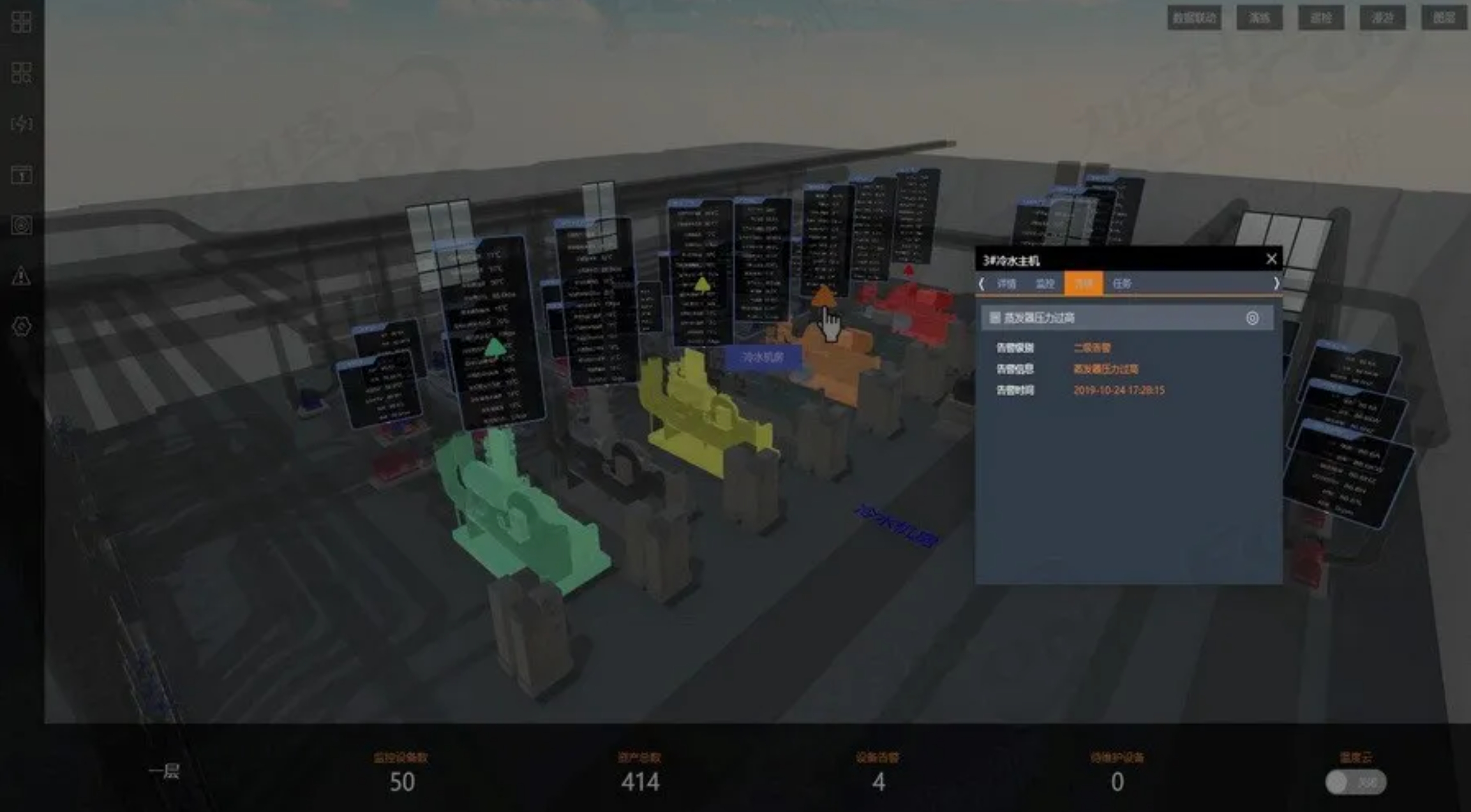 在建成的平台中,通过将现实物理工厂的建筑样貌、楼层结构、设施设备、配电房等以三维可视化的形式呈现在虚拟工厂中,以真实、直观的模型对整个现实物理工厂中各个区域的设备数据、设备状态等实现监控,确保其正常运行。