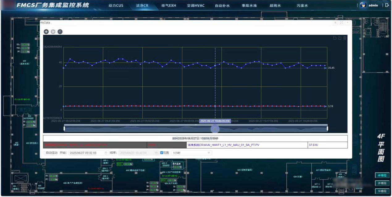 系统按动力CUS、洁净CR、排气EXH、空调HVAC、自动补水、事故水池、超纯水、污废水等八大子系统进行流程可视化展示,覆盖生产工艺用水、恒温恒湿恒压环境控制及废气废水处理等环节。实时监测运行状态与工艺参数,优化调节PID参数,保障生产环境稳定可靠。